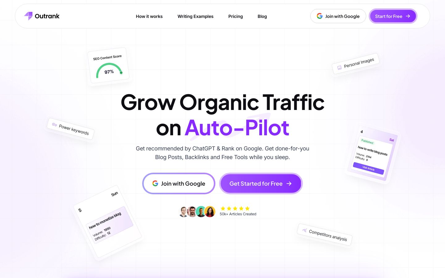 Outrank is a system for growing organic traffic on auto-pilot, built for small teams that want consistent publishing without turning content into a never-ending manual project.